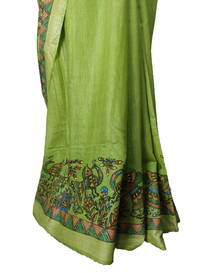 Discover the exquisite beauty of our hand made Semi Silk Saree from Smita's Arts, adorned with intricate Madhubani painting all around. Perfectly suited for parties, functions, events, festivals, and many more occasions, each saree is uniquely crafted, ensuring that no two are alike. Celebrate individuality and elegance with this one-of-a-kind piece, meticulously hand-painted to elevate your style. Make a bold, eye-catching statement and captivate your surroundings with this stunning ensemble. Buy this product to merge tradition with contemporary flair, and experience the charm that only a unique Semi Silk Saree from Smita's Arts can provide.