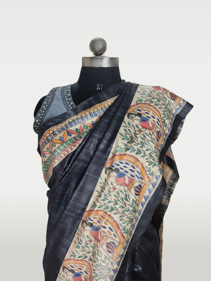 Discover the exquisite beauty of our hand made table dye Silk Saree from Smita's Arts, adorned with intricate Madhubani painting all around. Perfectly suited for parties, functions, events, festivals, and many more occasions, each saree is uniquely crafted, ensuring that no two are alike. Celebrate individuality and elegance with this one-of-a-kind piece, meticulously hand-painted to elevate your style. Make a bold, eye-catching statement and captivate your surroundings with this stunning ensemble. Buy this product to merge tradition with contemporary flair, and experience the charm that only a unique Silk Saree from Smita's Arts can provide.